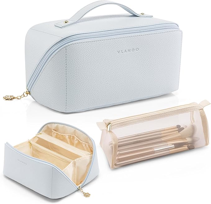 Vlando Makeup Bag,Large Capacity Toiletry Bag for Women Waterproof Portable Make up Pouch PU Leather Open Flat Cosmetic Bag(Baby Blue)