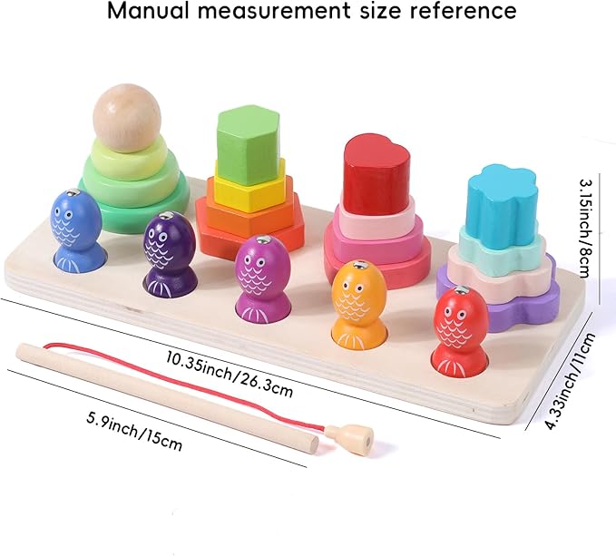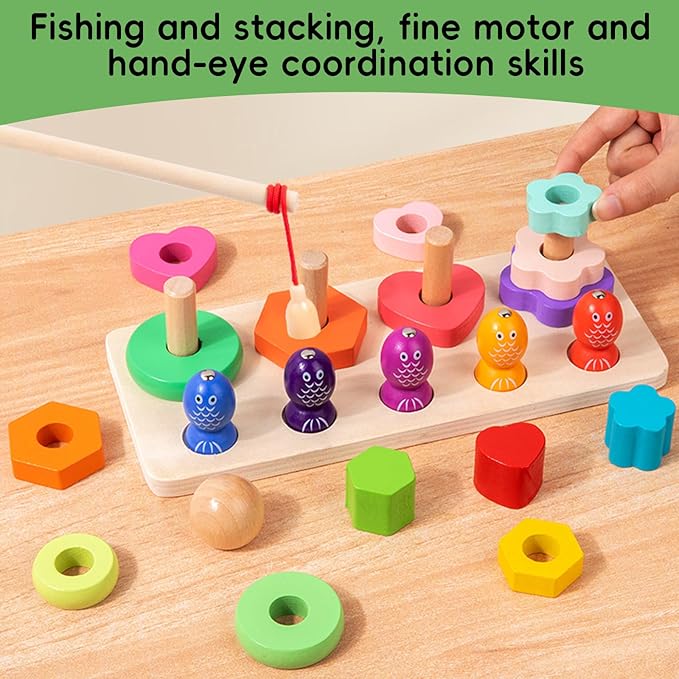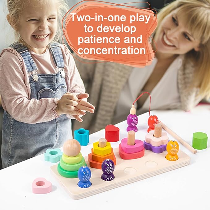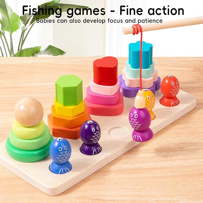 - Puzzle Fun Stacking and fishing games: Stacking a variety of wood blocks of different shapes and sizes is a great way to develop focus and patience in your 3-5 year old baby. The magnetic fishing game will make the children surprised and long-lasting fun to explore.