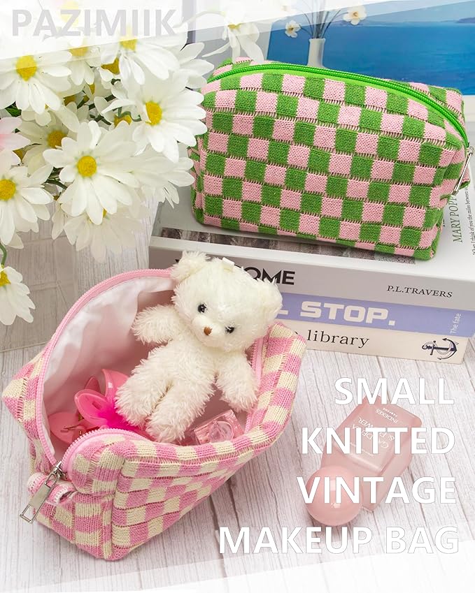 PAZIMIIK Checkered Makeup Bag for Purse Portable Zipper Make Up Pouch Small Cosmetic Case for Travel Accessories Pink Beige