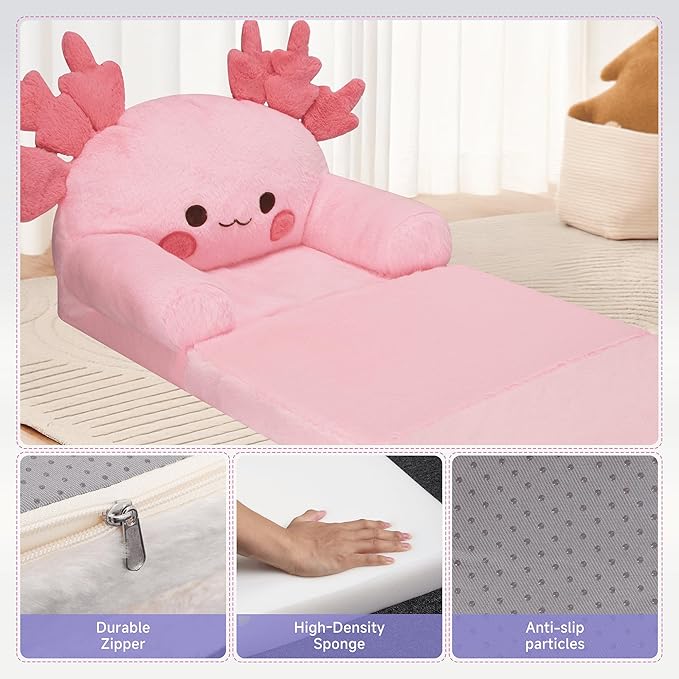 MONKISS 2-in-1 Toddler Couch Chair Comfy, Kids Chair Couch, Mini Couch, Flip Out Sherpa Kids Sofa, Baby Couch, Chair for Toddlers 1-3, Kids Lounge Chair Reading Chair, Kids Couch Bed Fold Out, Axolotl