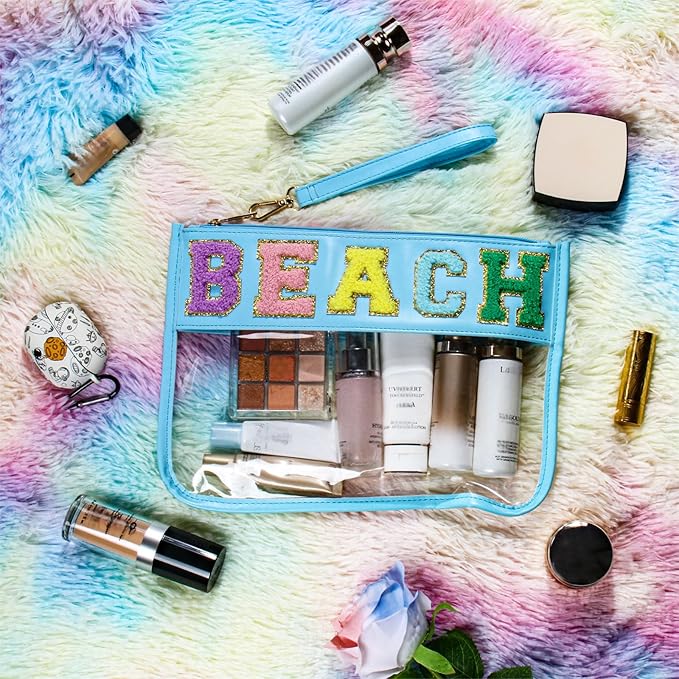 BuyCard Chenille Letter Bag, Clear Beach Purse, Clear Cosmetic Zipper Pouch for Travel, Portable Water-proof Preppy Makeup Toiletry Flat With Zipper, Organizer for Women Girls Blue