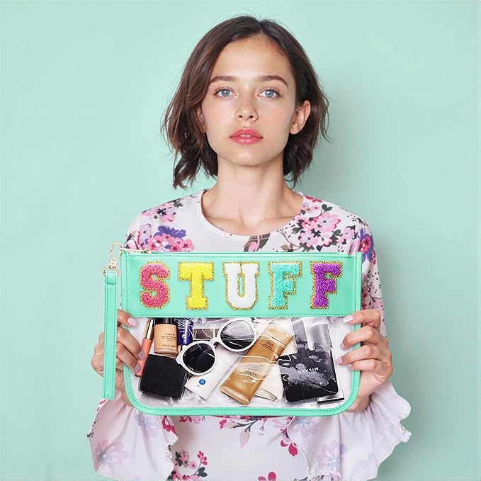 BuyCard Clear Stuff Bag for Travel, Preppy Chenille Letter Embroidered Zipper Pouch, Waterproof PVC & PU Leather Clear Cosmetic Bag, Toiletry Makeup Bag for Women Girls Mint Green