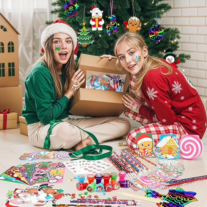- Package Include: you will get Christmas mini notebooks, Christmas pencils, Christmas erasers, Christmas make-a-face stickers, Christmas ornament cards or tattoo, stampers, stickers, color scratch or slap bracelets, Christmas rulers, clear gift bags.The quantity is enough to meet your Christmas gift needs, a complete Christmas party favor set for your use.