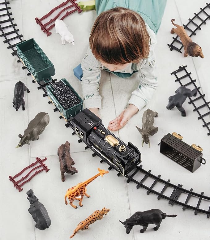 - This electric toy train set includes a battery powered locomotive with 1 coal tender, 2 cargo carriages, 14 pieces of train tracks, and 12 detailed safari animal figures, such as lions, elephants, and giraffes. Perfect for kids' birthday party decorations or everyday play, this wildlife-themed train set combines the fun of trains with the excitement of African jungle animals.