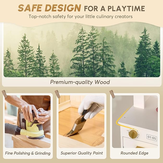 - Premium Wooden Play Kitchen: BIERUM play kitchen is crafted from ๐๐๐๐ & ๐๐๐๐๐ certified wood materials, ๐๐๐-๐ ๐ซ๐๐, and coated with non-toxic paint. It's sturdy & durable, and absolutely safe for kids. It also includes various cooking utensils with realistic with ๐ฅ๐ข๐ ๐ก๐ญ๐ฌ & ๐ฌ๐จ๐ฎ๐ง๐๐ฌ, making pretend play more vibrant and engaging.