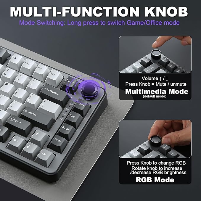 - 75% Percent Gasket Mount Mechanical Keyboard & Multimedia Control Knob:The B75 PRO is a compact keyboard with a knob and 82 keycaps. The TKL keyboard has number keys, function keys and arrow keys at the same time. The multi-function knob of the 75% compact mechanical keyboard enables you to adjust the sound level and backlit fast. Long press the multifunctional knob of this RGB keyboard can switch between gaming and office modes, rotate the knob to adjust the keyboard volume and RGB backlit effects