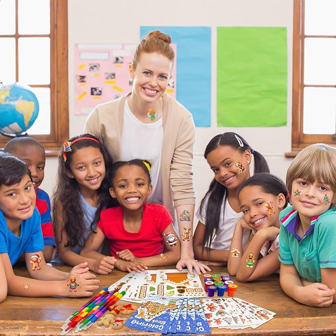 - Creative Pattern Design: our Merry Christmas classrooms DIY reward prizes are Christmas themed coloring books and DIY Tattoo stickers,Santa,Christmas tree,snowflake,snowman,bear,Elk patterns;These winter DIY coloring books will create winter Christmas atmosphere, suitable as gifts of Christmas Holiday Winter Party