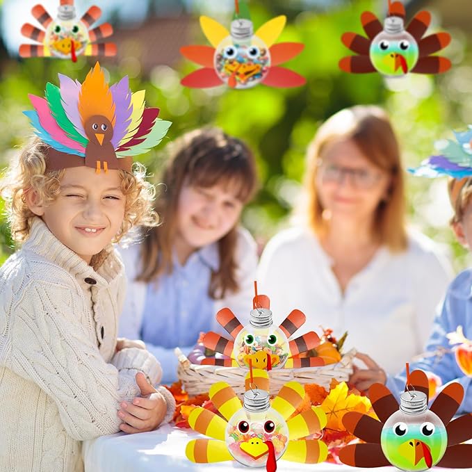 - Thanksgiving Craft Kit Includes: 12 container bottles (150 ml) and 12 expressions, 12 sets of colorful feathers cutouts (7 pieces per set), 12 ribbons and a roll of double-sided tape, a sufficient number of turkey craft kits allows you to DIY different turkeys, making your Thanksgiving more colorful