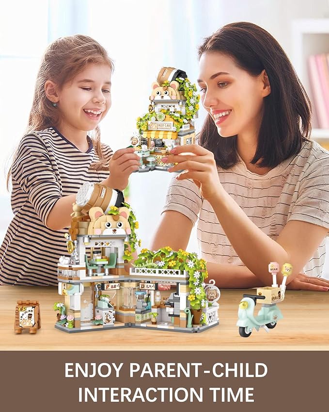 - High Quality: Bear theme cafe street scene building, with a beautiful box, made of safe ABS material, durable, lightweight, safe. The surface and edge of each block are smooth and burr free. All parts fit well and are not easy to loosen (mini size about 25% smaller than a standard brick)