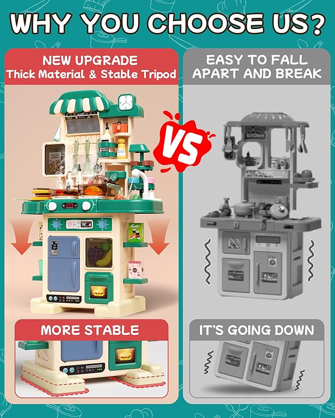 • 【NEW UPGRADE】The new kitchen playset toys uses higher quality materials, which not only surface is smooth and delicate, but also has a significant improvement in structure strength; New Tripods strengthen the design of the bottom support and solve the problem that is easy to turn over.