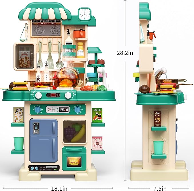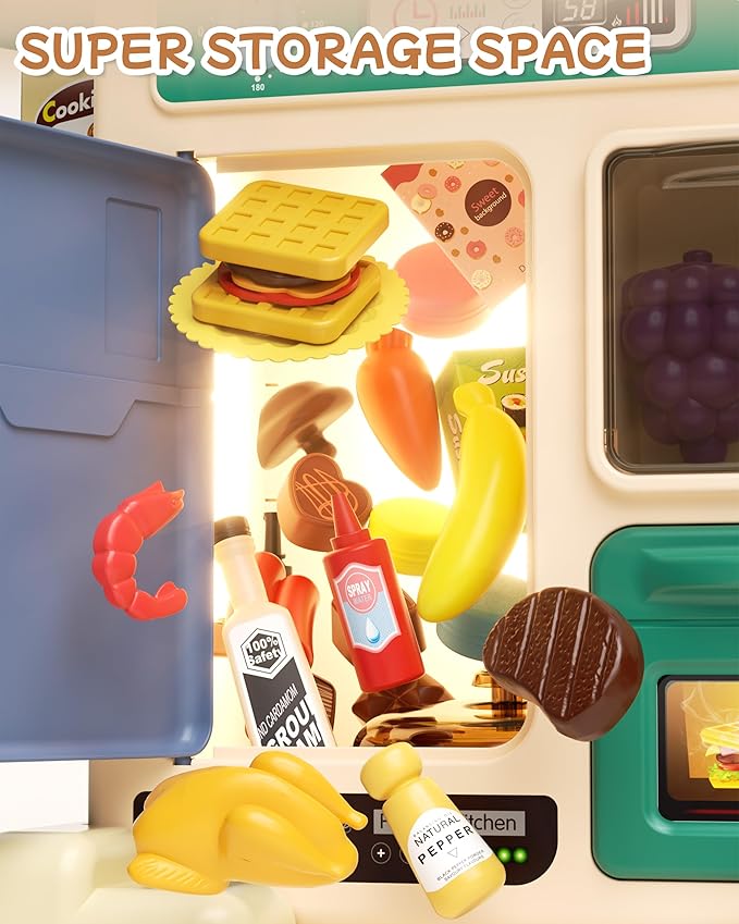 • 【Immersive Kitchen Play Experience】Dive into the world of cooking with this fantastic interactive toy kitchen set! Featuring a glowing electric stove, realistic cooking sounds, a running water sink, various toy foods, and kitchen accessories. Stay organized with ample storage including a refrigerator, oven and shelf.