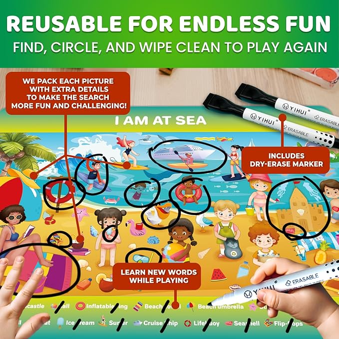 - REUSABLE SEARCH AND FIND MATS: Endless fun car ride activities for kids ages 4-8 with dry erase markers; kids can read, find, circle, and wipe clean to play again; perfect for airplane games, toddler car games, and road trip activities for kids 3-5