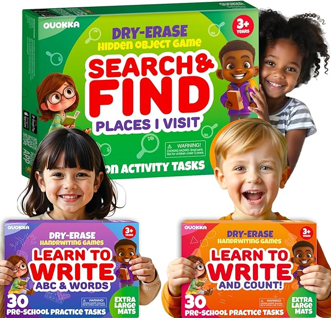 QUOKKA Busy Book Handwriting Practice for Kids - Search & Find - Activity Cards for Kids 3-8 – Reusable Mats with Dry-Erase Marker, Explore 20 Topics, Road Trip Activities, and Travel Games