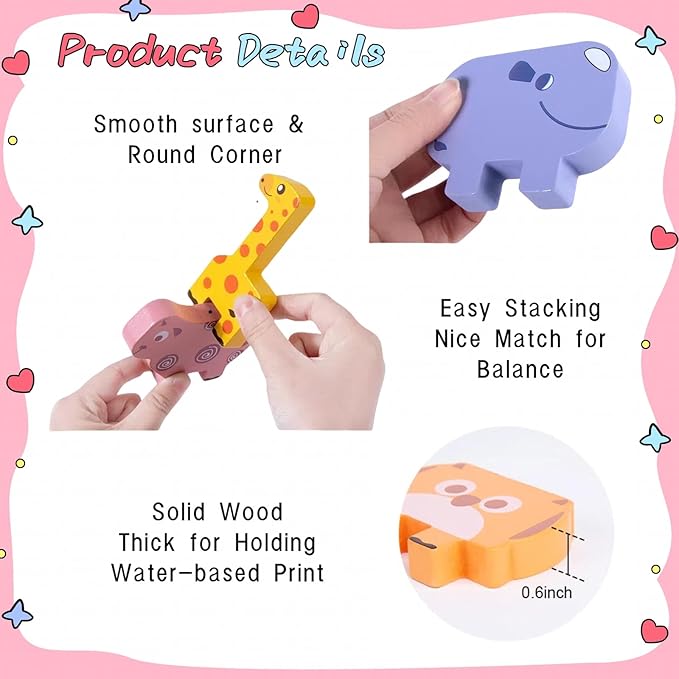 - 【Wood Animal Blocks】toddlers will be attracted by the colorful animal blocks like giraffe, sheep, dog, cow, crocodile, hippo, elephant, mouse, bear, and rhino. This interactive play helps them learn animals and colors, boosting cognitive skills as they explore each piece with curiosity and joy.