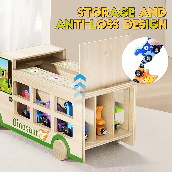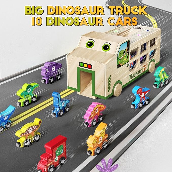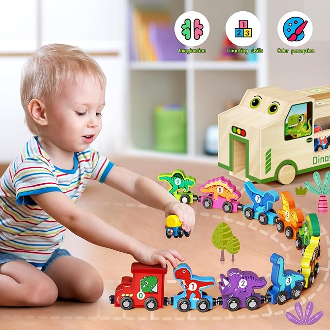 - Dinosaur Truck & Train Combo - STEM toys trucks meet Montessori-inspired dinosaur truck play! This dinosaur toy for kids 3-5 features a T-rex-driven wooden carrier (13.4"L) with 10 magnetic train cars. The toddler train set converts instantly into a numbered 0-9 kids train for ages 2-4, developing spatial reasoning through ASTM-certified Educational Toys. "Order today to ignite their love for learning!"