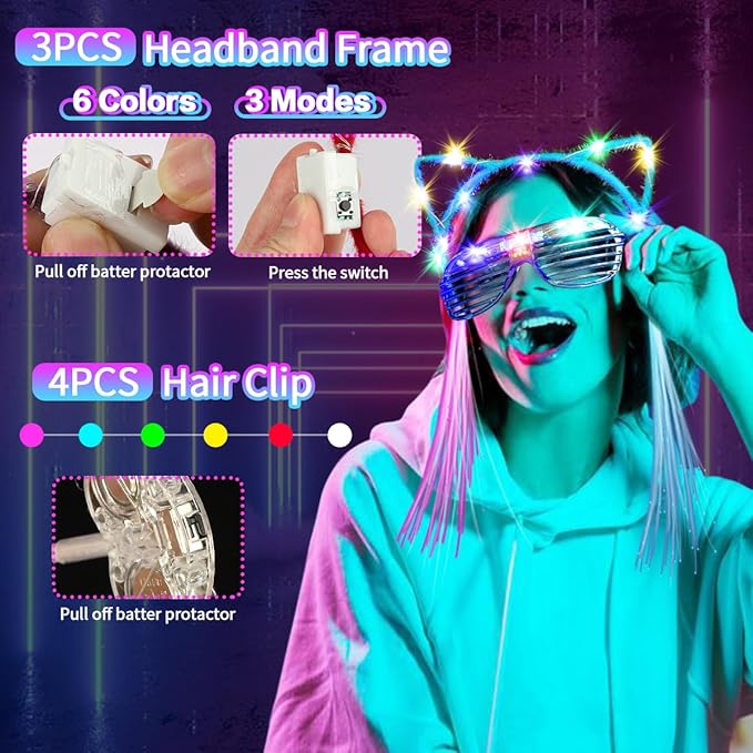 - 6 led GLASSES+4 HAIR CLIPS+40 FINGER LIGHT+13PCS Butterfly Bracelet Connector.3 Cat LED Headband. Shutter Shade led Glasses have 3 modes-fast flashing, slow flashing&constant. Hair clip can emit light with 7 colors, they will bring the party extraordinary fashion vibe.All internal batteries can last over 8 hours.