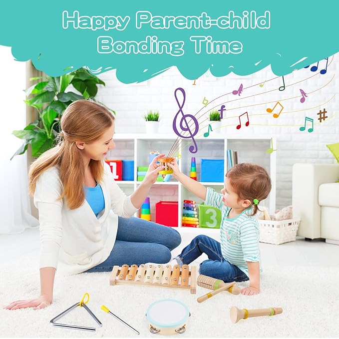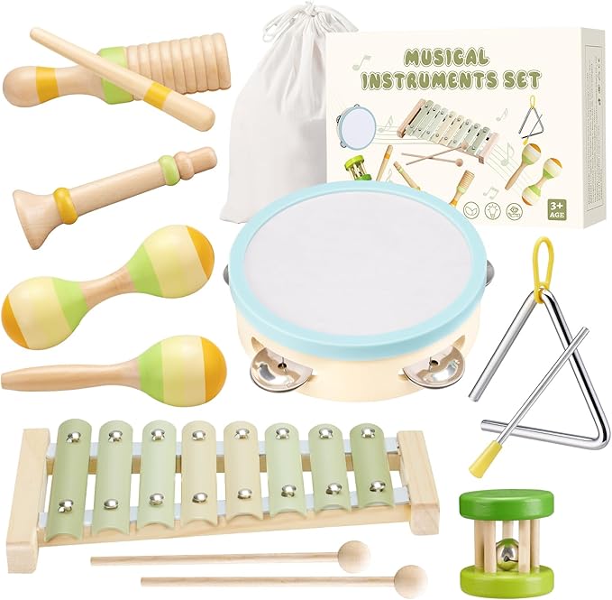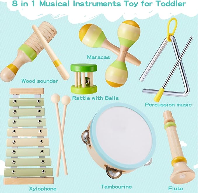 - 【NEWEST Kids Musical Instruments】: This adorable musical instruments with neutral colors includes an 8-tone xylophone with mallets, a tambourine, two maracas with differents head, a trumpet, a triangle with striker, a wooden rattle with bells and a wood sounder. A full set of montessori musical toys to meet your baby's different musical needs, perfect preschool educational toys for 2 year old.