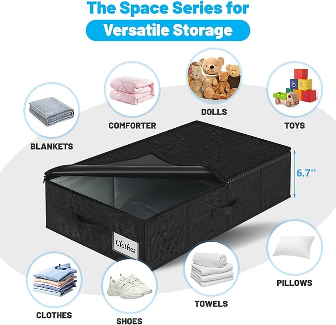 - Spacious Design with Ample Capacity: Measuring 30" x 16" x 6.7", the under bed storage containers of the Space series provide ample space for clothes, comforter, bedding, shoes, toys and blanket storage. Their large capacity is ideal for keeping your room clutter-free, while the low profile under bed storage ensures they fit effortlessly under beds and sofas, making them a versatile solution for closet organizers and storage.