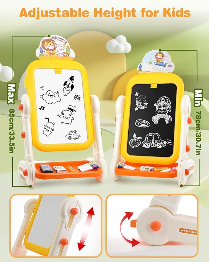 • Easy Assembly & Adjustable Height: You have the option to choose between two leg lengths based on your child's height and preferences. Tool-free setup with hand-tightened screws makes assembly a breeze. Gleamkid little partners easel has adjustable height from 78 to 85 cm (30.7 to 33.5 inches) accommodates kids of various ages, while the board can be tilted or rotated using base screws, satisfying different needs