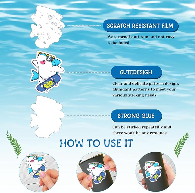 - Creative Shark Stickers: Our shark stickers come in a variety of cute designs and bright colors, featuring different shark expressions. Ideal for decorating cards, gifts, laptops, backpacks, and more, these stickers are a great way to boost creativity and add a splash of fun to everyday items