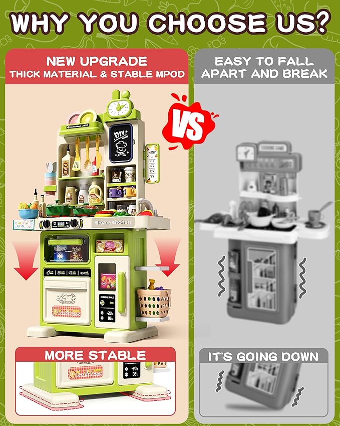 • 【NEW UPGRADE】Our new 33.8 inch kitchen playset uses higher quality materials, which not only surface is smooth and delicate, but also has a significant improvement in structure strength; New Tripods strengthen the design of the bottom support and solve the problem that is easy to turn over.