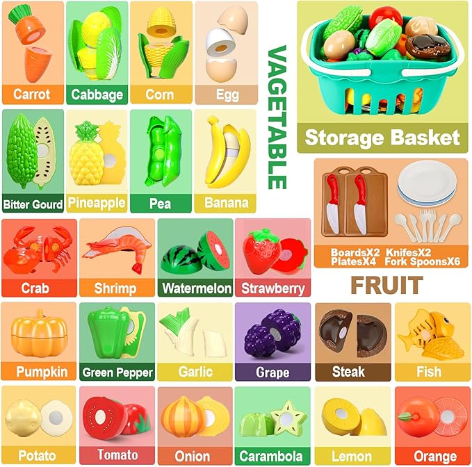 - Realistic Design Cooking Toys: Our fruits and vegetables can be sliced, the peas and eggs can be peeled, and the crabs can be shelled. They can be cut repeatedly and then can match each pieces together easily.Also neatly stored in an organizer basket!