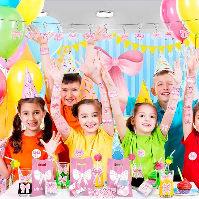 - Package Include: The pink coquette bow party favors contain 12 sheet pink bow temporary tattoos, 12 pcs pink bow slap bracelets, 50 pcs pink bow stickers, 12 pcs pink bow acrylic keychains, 12 pcs pink bow badges, 12 pcs pink bow gift bags, Enough quantity to meet your pink bow party needs