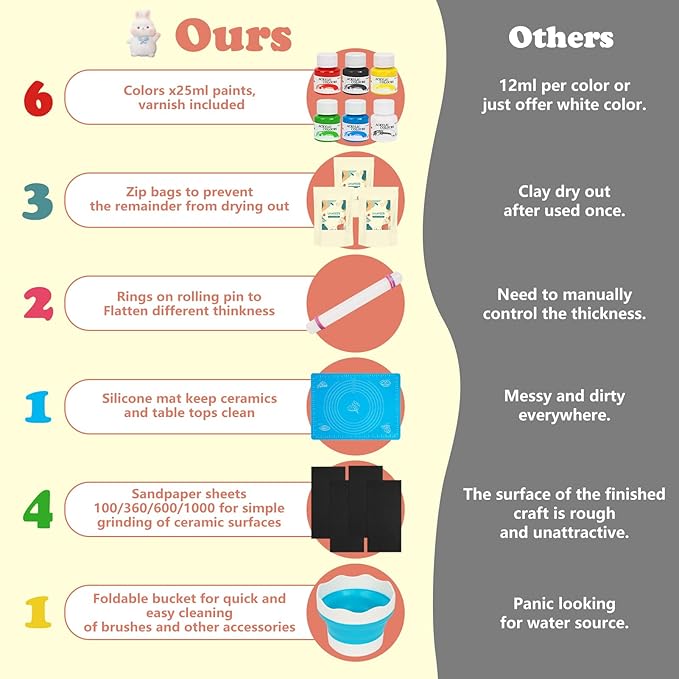 - Comprehensive Pottery Kit: This all-inclusive air dry clay starter kit includes all the necessary materials to start your pottery journey - 3 x 1lb/500g air dry clay with storage bags, 1 x gloss varnish, 6 x acrylic paints, 8 x sculpting tools, 1 x sponge, 1 x palette, 1 x foldable bucket, 2 x brushes for detailing, 1 x work mat, 1 x spray bottle,1 x rolling pin, 1 x guide manual with a video tutorial. Transform your leisure time into a fulfilling pottery experience with the our airdry clay kit!