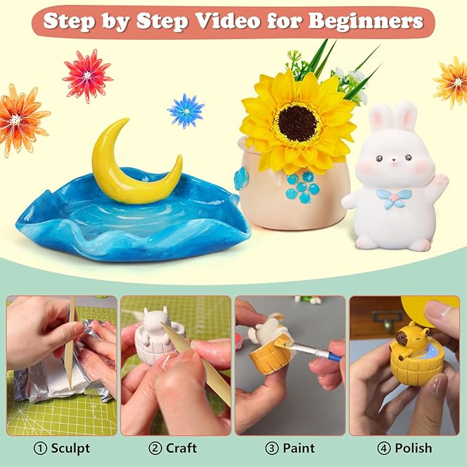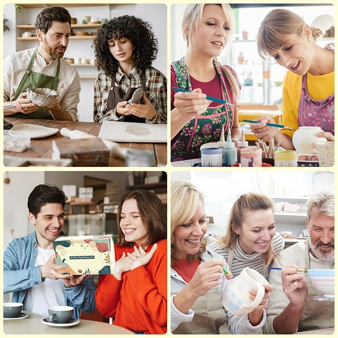 - Multipurpose Fun: This versatile pottery starter kit allows you to sculpt, color, and seal your creations, suitable for crafting diverse items such as flower pots, trinket trays, vases, ashtrays, decorations, candle trays, animal accessories, sculptures and so on. This clay craft kit not only help you get into a flow state of relaxed mindfulness, restore focus and alleviates anxiety, but also is perfect for solo projects, couple's crafts, family fun or even as a clay date night kit.
