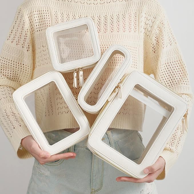 - ❤【LUXURY DESIGN】Measuring 9'' x 6.5'' x 3''(23cm x16.5cm x 7.8cm) in large and 7.9'' x 5.7'' x 2.7'' in small, our makeup bag is sleek and stylish, this makeup travel organizer was designed in a minimalist boxy shape and a clean white color. Crafted in beautiful PU leather and finished with polished hardware, it's the clear pouch you'd be happy with sitting out on display beside you.