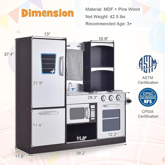 - Realistic Kitchen Experience: Our 42.5LBS Children's Kitchen Toy Set offers a realistic play kitchen experience for children over 3 years old. With a wooden design and a variety of features including a microwave, stove, sink, faucet, storage cabinet & shelf, and even curtains, this toy set provides endless hours of imaginative play.