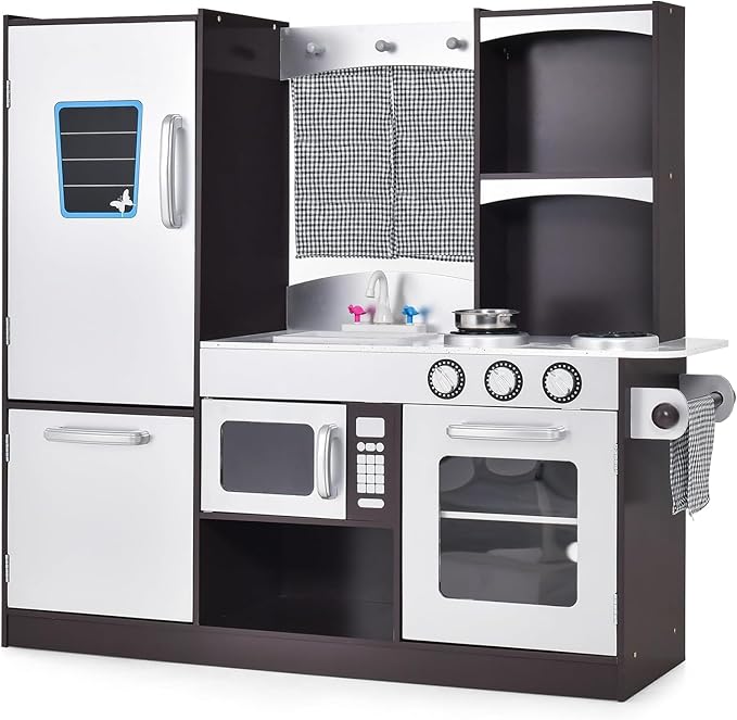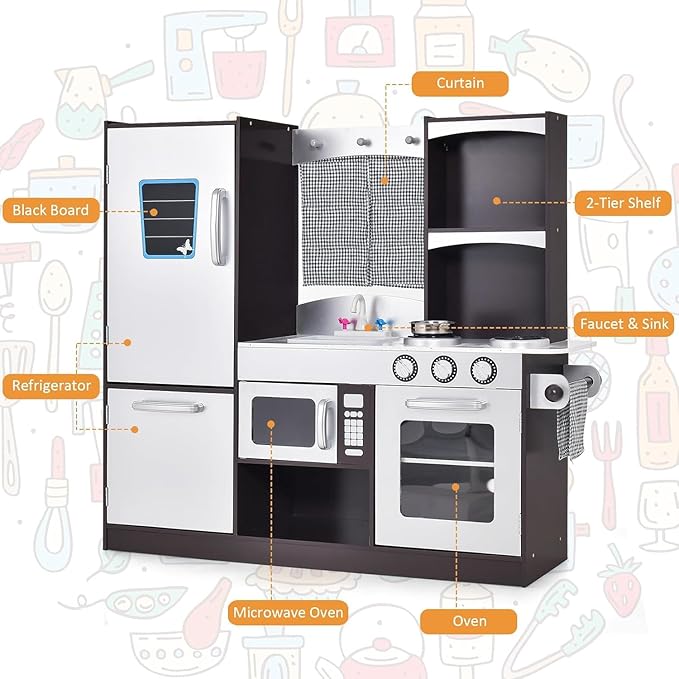 • Realistic Kitchen Experience: Our 42.5LBS Children's Kitchen Toy Set offers a realistic play kitchen experience for children over 3 years old. With a wooden design and a variety of features including a microwave, stove, sink, faucet, storage cabinet & shelf, and even curtains, this toy set provides endless hours of imaginative play.