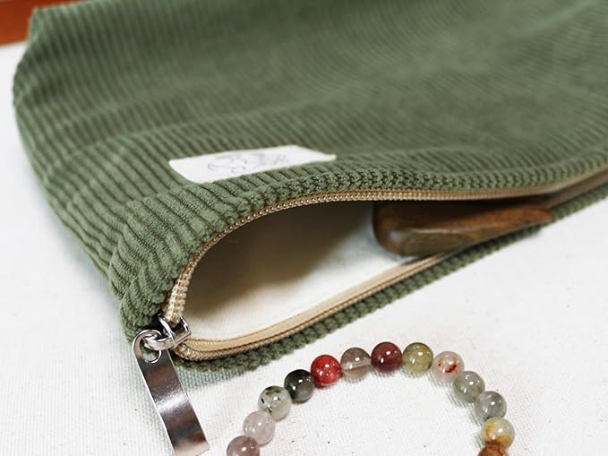 HAPPYHEIDI Navy Green Corduroy Makeup Bag Cosmetic Toiletry Travel Pouch, Make Up Accessory Purse Organizer, Canvas Lined