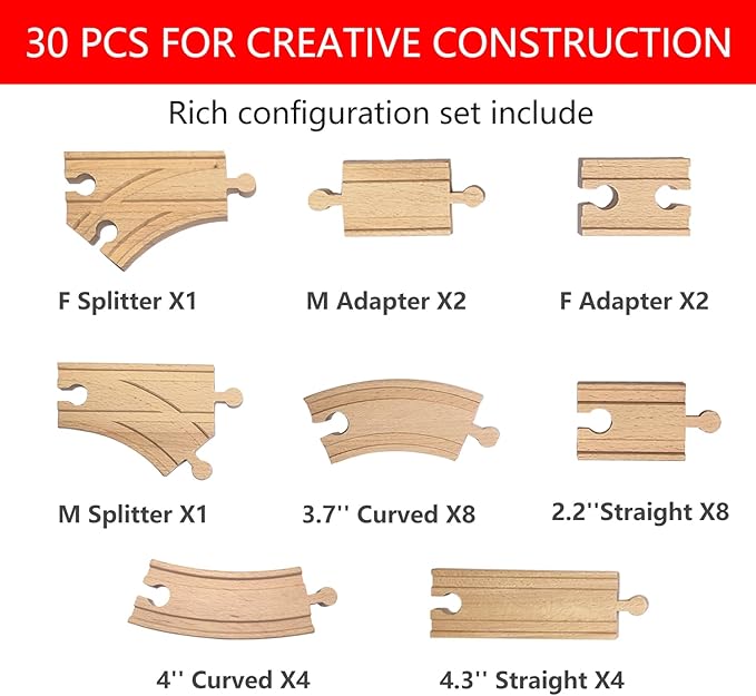 - 30 Pcs Train Tracks Toys Includes: 2.2inch Straight Tracks*8, 4.3inch Straight Tracks*4, 3.7inch Curved Tracks*8, 4 inch Curved Tracks*4, M Adapter*2, F Adapter*2, M Splitter*1, F Splitter*1.