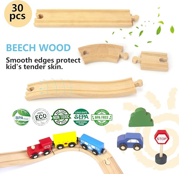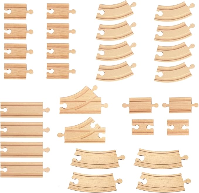 Wooden Train Track 30 Piece Set, Train Track Expansion Compatible with All Major Railroad Brands Including Thomas Wooden Train, Brio, Thomas The Tank Engine