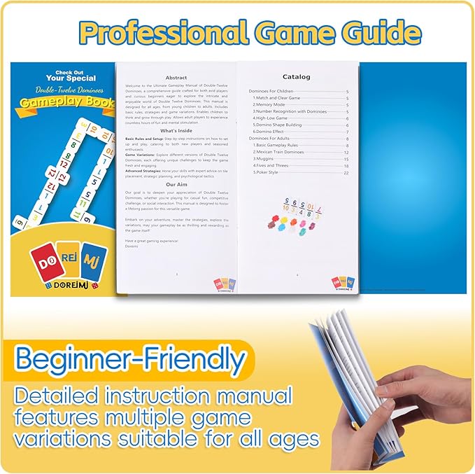 - Beginner-Friendly:Our Mexican train dominoes set includes Well-designed game manual to accommodate players of all ages and skill levels. With a variety of gameplay options clearly outlined, newcomers will find it easy to dive in, while experienced players can explore advanced strategies.Whether you’re playing dominoes with young kids or seasoned adults, everyone can discover a game style that resonates with them.