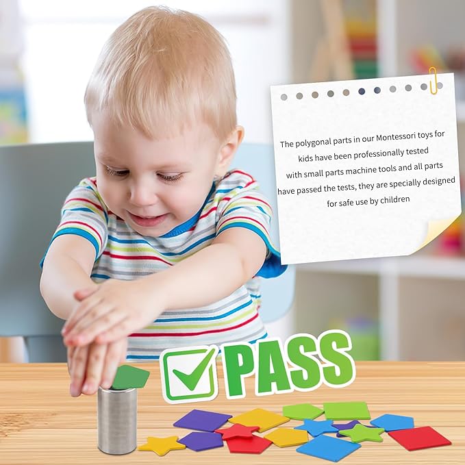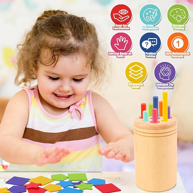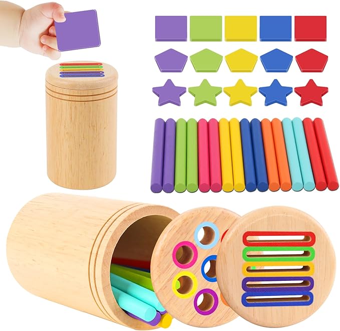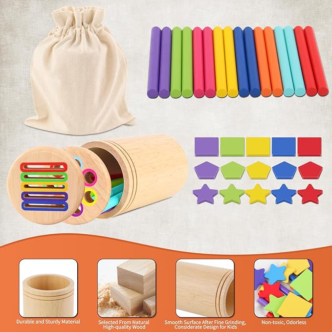 - Sensory Toys Designed for Kids Especially: Our color shape sorters sensory stacking toys are designed for kids to play with. The length of the wooden sticks and the shape of the wood chips are suitable. The wooden sticks are not long and the size of the wood chips is suitable. In addition, the wood chip parts have been screened by the small parts filter tool. They are safe to use and can cultivate kids' concentration, allowing them to play for a long time and stay away from electronic screen