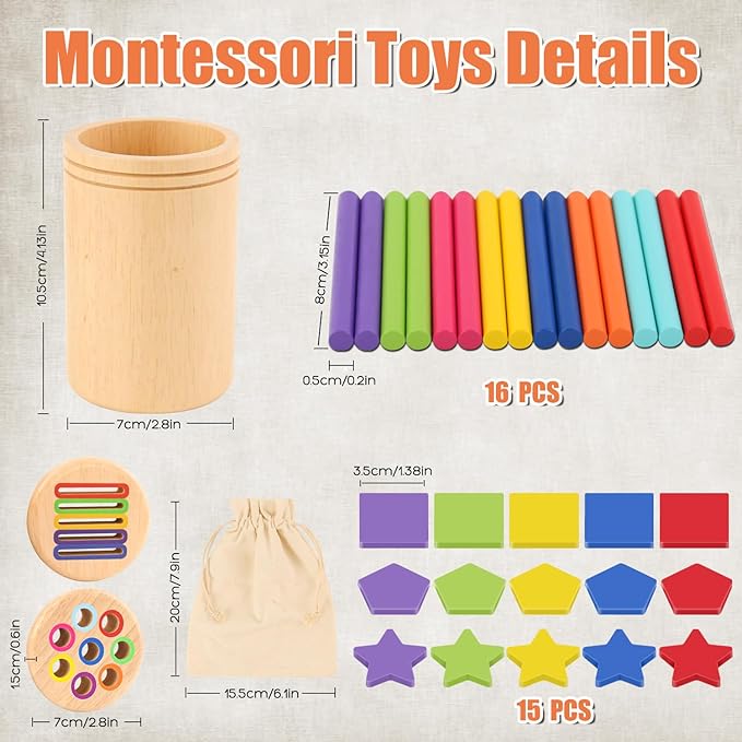 - Montessori toys for 3+ Years Old Toddlers: Our 35pcs wooden color sorting toy stacking set includes: a wooden pen holder sorter, 1 wooden stick color sorting lid, 1 wooden shape color sorting lid, 16 sticks (8 colors, 2 sticks of each color), 15 wooden multi-shaped wooden chips (5 colors, 3 chips of each color), and 1 reusable storage bag. It is very suitable for 4 5 years children who like to insert things into slots or holes, which can exercise their fine motor skills well