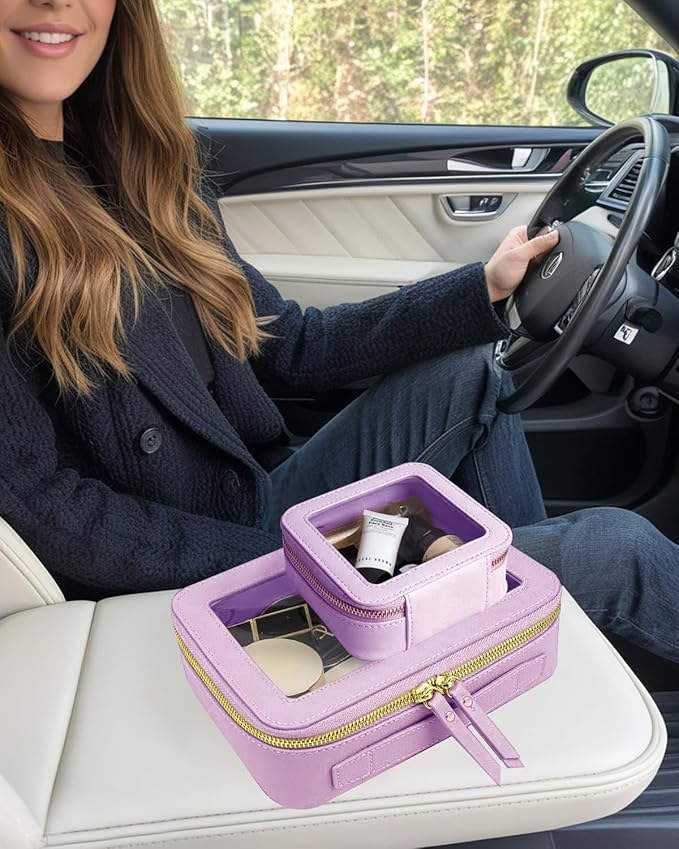 - Car Must Have Essential: Our large and small travel toiletry bag is roomy to store your makeup brushes, lipstick, eyebrow pencil, make-up foundation,skin care, cables, chargersor and other little items.It make your daily make-up, cream, lipstick, perfume and other beauty things organized and protected.This clear mini toiletry bag can be a good car accessory fits in the center console or other parts of your car.