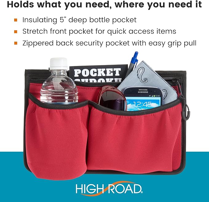High Road Wheelchair Side Bag - Stretch Neoprene Walker Pouch with Insulating Cup Holder and 2 Storage Pockets