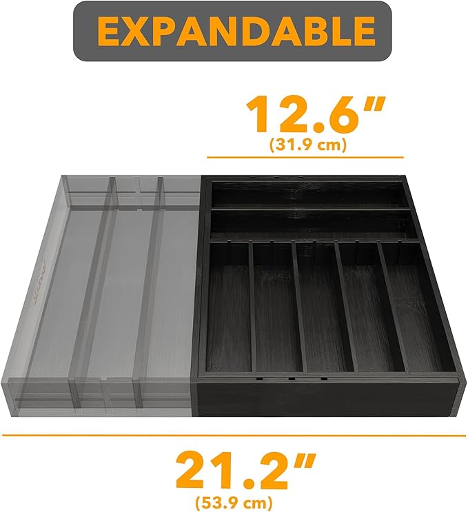- ORGANIZED AND BEAUTIFUL - Make your kitchen drawer neat and organized with bamboo silverware organizer. The utensil organizer is designed for your different silverware kitchen storage organization; SIZE: 16.9"L x 12.6"-21.2"W x 2.5"H