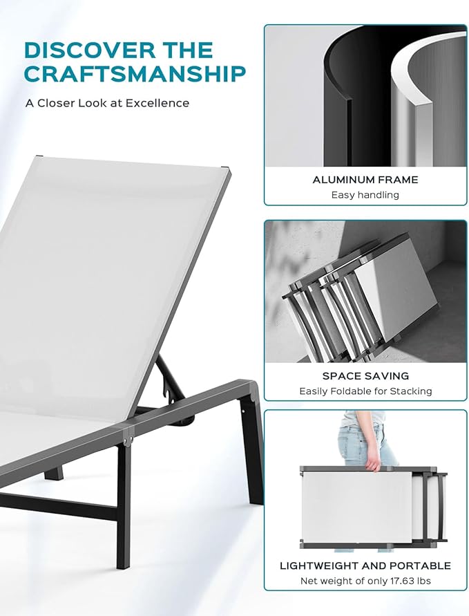 - 【EASY MAINTENANCE】This chaise lounge boasts a robust aluminum frame and premium Texitilene fabric. Durable and weather-resistant, the lightweight Texitilene material is breathable and quick-drying, ensuring air circulation and ventilation on hot days for optimal comfort