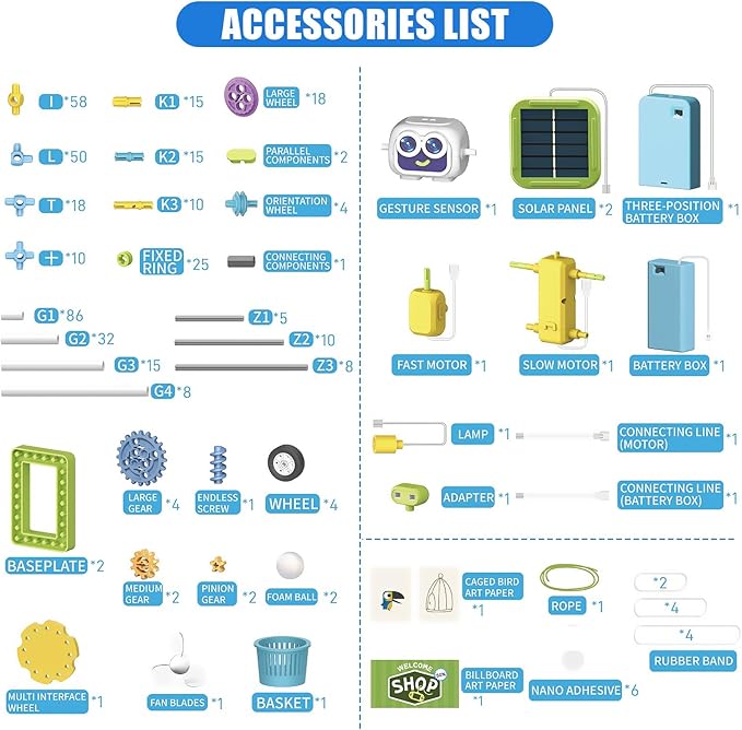 - Educational Science Kit: Our science kit includes a variety of components such as gesture sensors, solar panels, battery box, motor, LED lights, conveyor belt, and wheels. Children can build their own robots and develop their scientific literacy, logic, and creativity