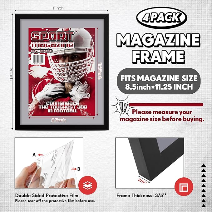 Geetery 4 Pcs Sports Magazine Frame for Wall Fits Measuring 8.5 x 11.25" Magazine Display Frame with Installed Hangers and Core Matting Plastic Comic Book Frames for Wall Hanging(Black, Grey Mat)
