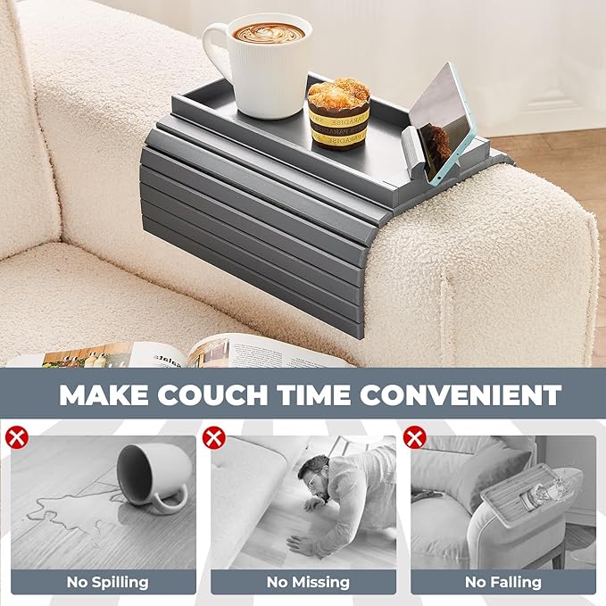 - DETAIL DESIGN: The spacious couch arm tray can accommodate more of the items you need, such as beverages, snacks, phone,remote control, keys, and more; The design with edges can also effectively prevent drinks from splashing and items from falling; The foldable design is convenient for use and storage.