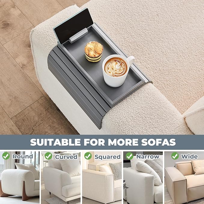 - FITS VARIOUS SOFA ARMRESTS: Our sofa arm tray table for couches applies to most sofas, for wide armchairs, flat, rolls, and straight arms. It adapting to minimum armrest width 6'' flat to 18'' rolls or straight arms. (Measure Your Couch Arm Before Ordering). Our couch arm table can not only be placed on the armrest of the sofa, but can also be used flat, such as computer tray tables, beverage racks, meal mats, and food trays. etc.