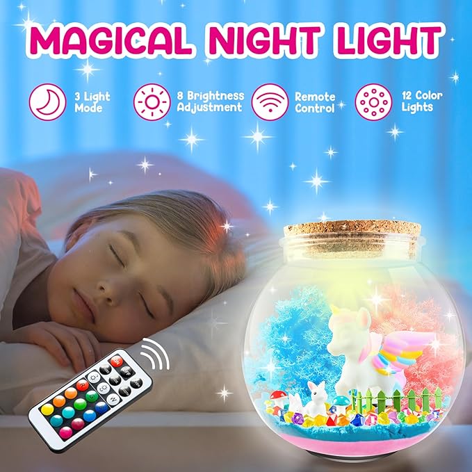 - GREAT GIFT FOR LITTLE GIRLS: Unicorn Night Light Kit is the perfect christmas & birthday present for girls ages 3-8. Set includes unicorns, planting tree, preserved moss, fence, crystal rock, mushrooms, bunnies, magic sand and a RC LED night light.