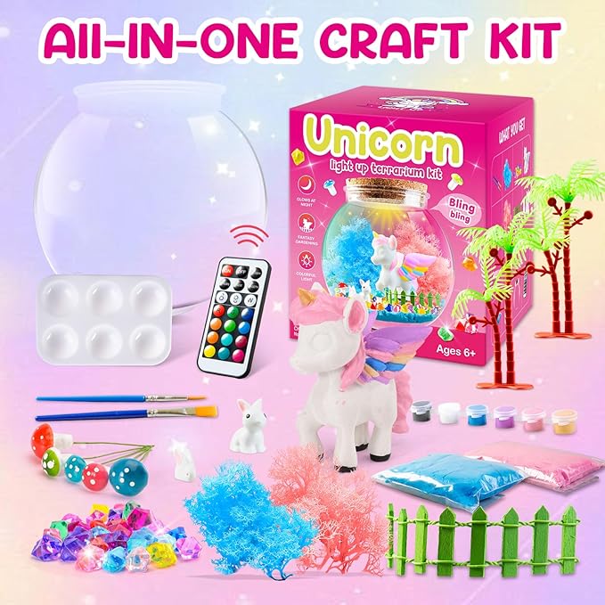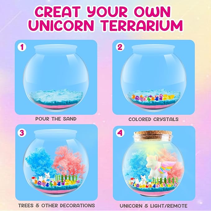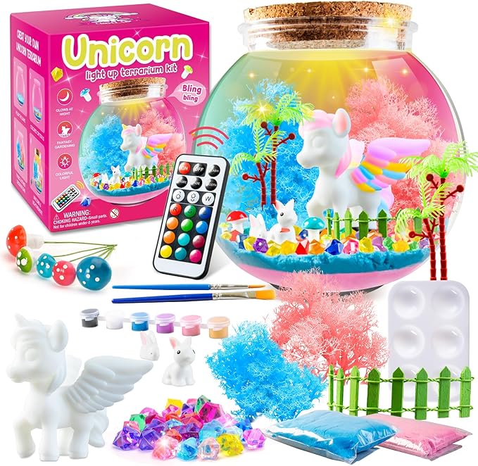 - UNICORN LIGHT UP KIT: This terrarium kit comes in an acrylic tank with a cork lid and contains everything your need to enjoy building their own terrarium kit. Your kids will discover the beauty of nature with this unicorn arts & crafts kit.