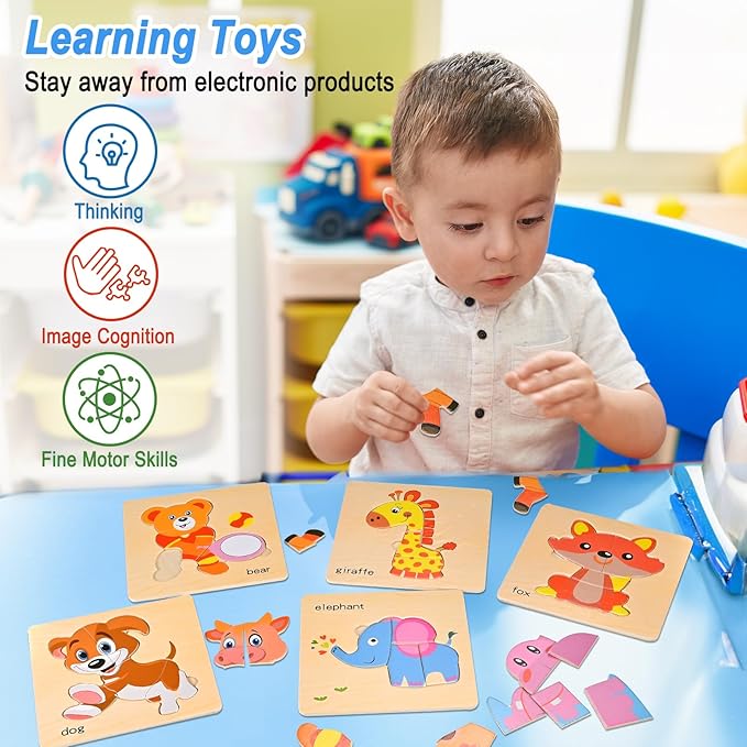 - 【Safer & Higher Quality】--The wooden puzzle for toddlers has larger particles and polished edges, making it safer, stronger, and more durable. Make sure your little hands can easily grasp these wooden blocks and complete the puzzle. The baby puzzle toy set is easy to assemble and is very suitable for children aged 1-5.