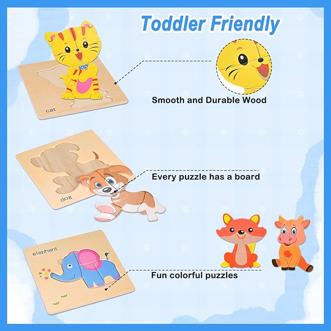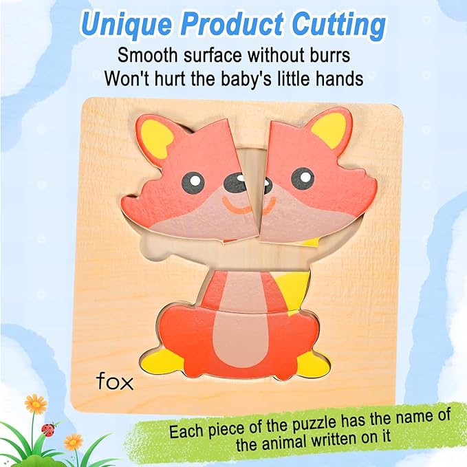 - 【Education & Entertainment】--On each kids puzzles, the names of animals are written: fox, elephant, giraffe, cow, cat, dog, bear, hippo. Help children understand animals through puzzle games. During the puzzle process, the baby's fine motor skills and problem-solving abilities were improved. It can stimulate exploration and exercise a baby's hand eye coordination ability.